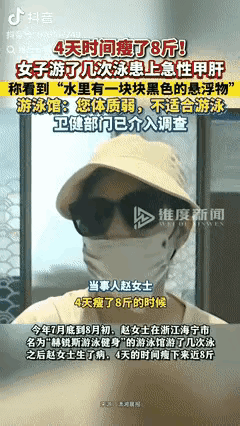 “这下后悔了吧!”浙江海宁,李女士去游泳馆游了几次泳,4天时间瘦了8斤,女子感觉不对劲,就去医院检查,不料,竟查出被感染了急性甲型肝炎,严重要面临肝移植,女子怀疑是游泳馆的水质不合格,才导致她患病,可游泳馆却称是女子体质弱,不适合游泳!