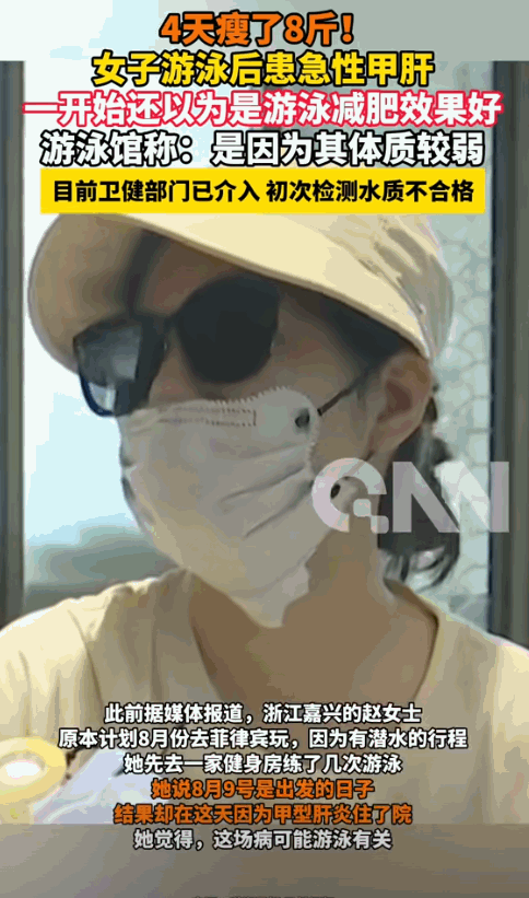 “这下后悔了吧!”浙江海宁,一女子去游泳馆游了几次泳,4天时间瘦了8斤,女子感觉不对劲,就去医院检查,不料,竟查出被感染了急性甲型肝炎,严重要面临肝移植,女子怀疑是游泳馆的水质不合格,才导致她患病,可游泳馆却称是女子体质弱,不适合游泳!
